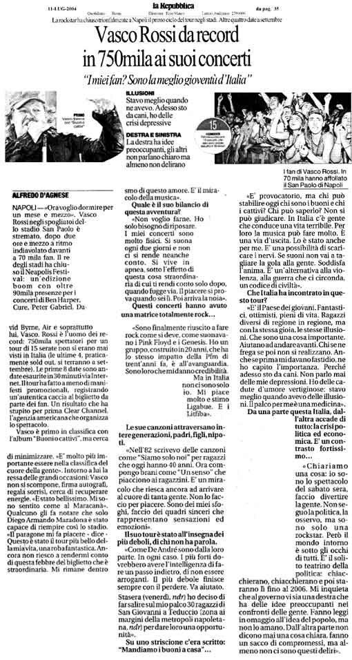 Rassegna stampa Vasco Rossi Buoni o Cattivi - Napoli 09/07/2004