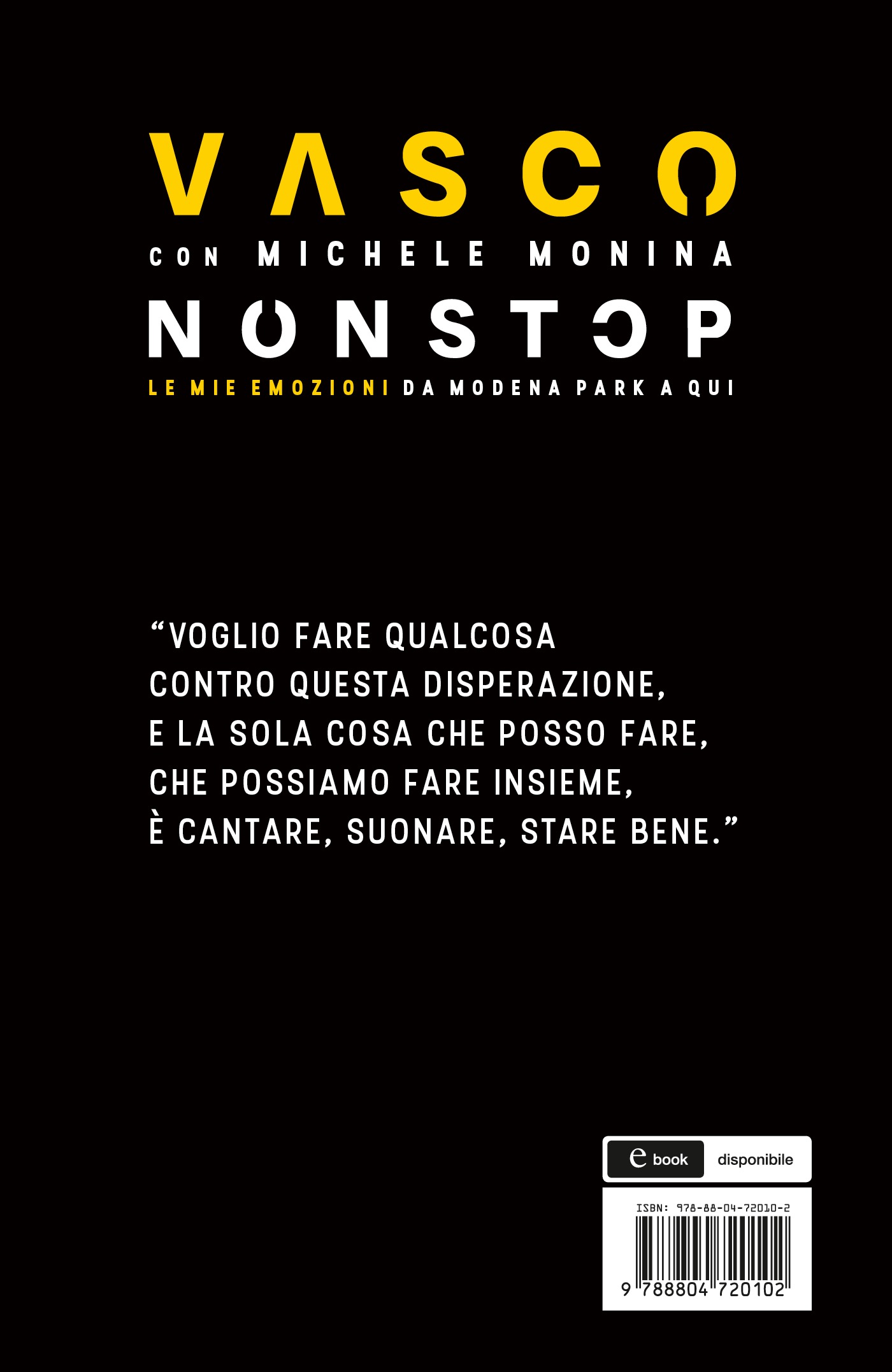“Negli ultimi tempi mi guardo intorno e vedo la disperazione della gente. Ecco, io voglio fare qualcosa contro questa disperazione, e la sola cosa che posso fare, che possiamo fare insieme, è cantare, suonare, stare bene.” Vasco è un libro aperto. Nel senso letterale del termine: questo libro. Che è il suo racconto – parola per parola, foto per foto – della grande impresa appena compiuta: il Vasco NonStop Live 019. Un libro che è un concentrato di Vasco pensiero registrato dallo scrittore e critico musicale Michele Monina in tempo reale, mentre si sta allestendo il tour, mentre il tour si sta svolgendo, fino all’ultima data, fino all’ultimo fuoco d’artificio. Un diario in presa diretta del tour più emozionante di sempre. Una lunghissima chiacchierata iniziata subito dopo il concerto record del Modena Park e che affronta non solo la musica, ma tutte le tematiche sociali che per oltre quarant’anni hanno accompagnato la sua produzione e la sua carriera. Dall’emarginazione al pregiudizio, dalla voglia di libertà alla volontà di contrastare con tutte le forze e l’ironia l’idea ottusa che vuole l’altro da sé sempre e comunque peggiore. Un Vasco a tutto tondo, sempre più diretto, incisivo, come nei testi delle sue canzoni. Un Vasco anche più risolto, quello di questo secondo tempo della sua carriera, certo non meno arrabbiato, ma più deciso a farsi portavoce di un disperato bisogno di felicità proprio oggi, nell’epoca degli hater e del razzismo prêt-à-porter. Dai preparativi del suo ennesimo record, sei sold out di fila a San Siro, alla chiusura in bellezza con la magica trasferta in Sardegna, rivivrete le tappe del Tour grazie ai commenti di Vasco e alle emozionanti immagini dell’album fotografico che completa il libro.