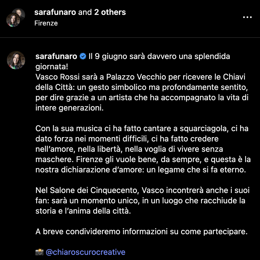 Vasco Rossi sarà a Palazzo Vecchio per ricevere le Chiavi della Città: un gesto simbolico ma profondamente sentito, per dire grazie a un artista che ha accompagnato la vita di intere generazioni.