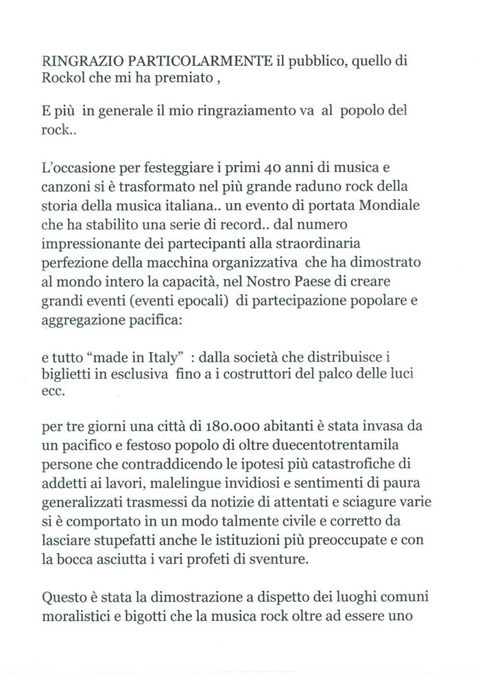 E' stata la dimostrazione a dispetto dei luoghi comuni moralistici e bigotti che la musica rock, oltre ad essere uno splendido veicolo per le emozioni è uno strumento di aggregazione capace di fare stare insieme giosamente masse di individui diversi che per una sera possono dimenticare i loro guai e problemi personali
