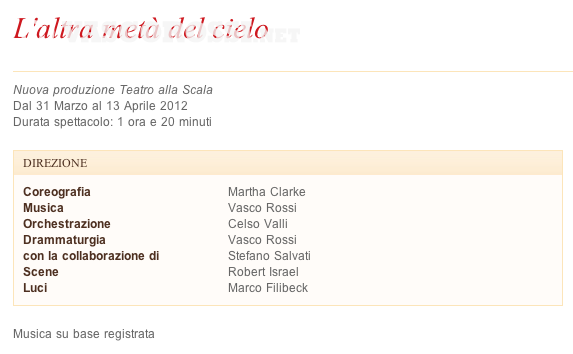 Vasco d'altra parte e' un grande amante della danza e 'L'altra meta' del cielo' e' due un omaggio alle sue passioni. Il debutto e' il 31 marzo; le date successive il 3, 4, 5, 6, 7, 11 e 13 aprile.